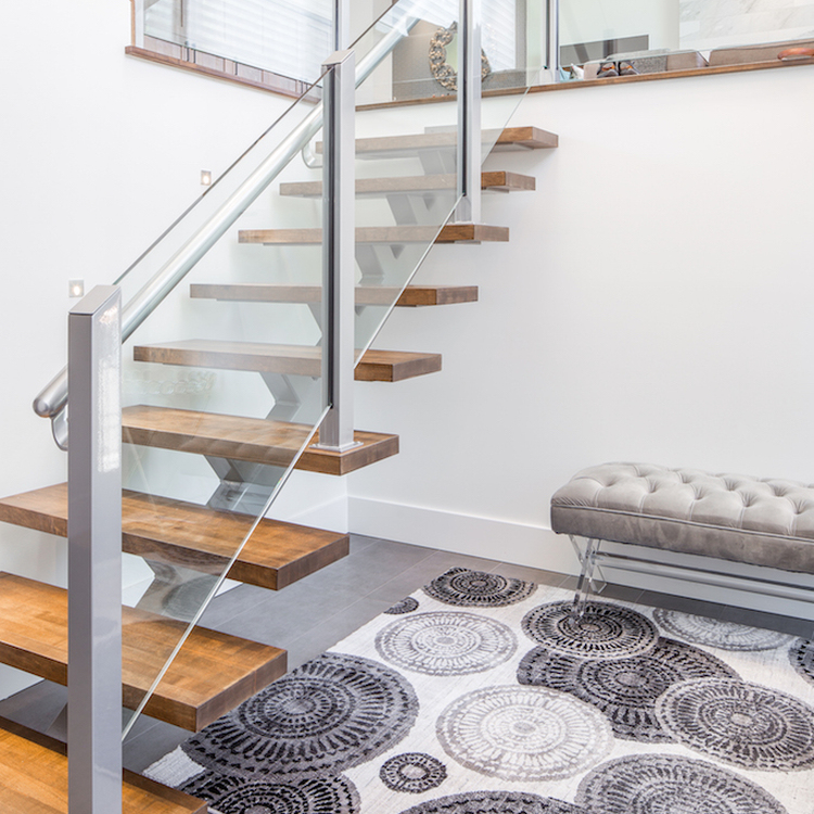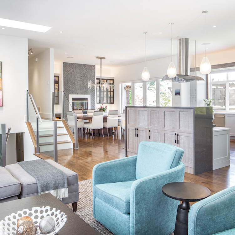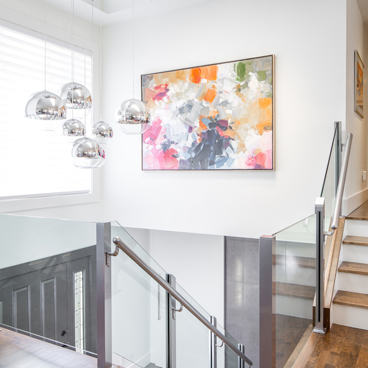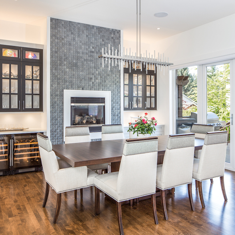 Glass railings on the floating staircase keep things open, and bold light fixtures and art add personality. In the dining area, a tiled gas fireplace framed by dark built-ins and a wine fridge sets the tone for cozy, stylish entertaining.