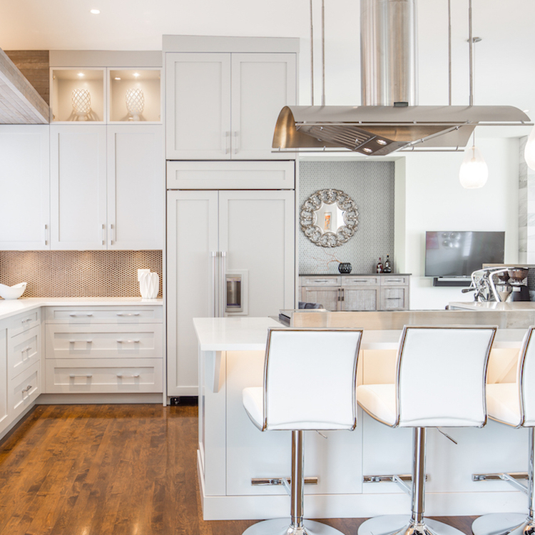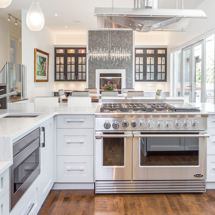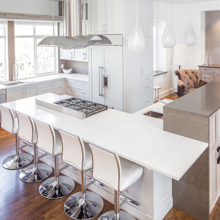 The kitchen stands out with its staggered-height island- dark quartz paired with whitewashed wood cabinetry for contrast and function. A ceiling-hung stainless hood and custom millwork add drama, while penny tile and warm wood details bring texture.