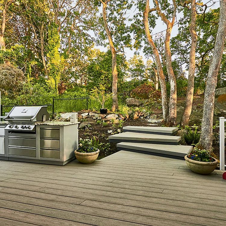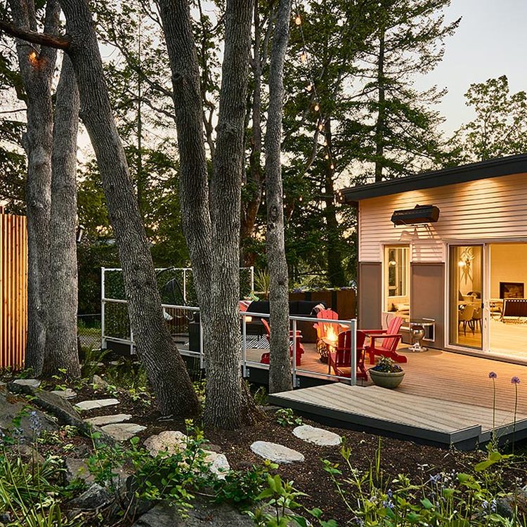 Expansive windows and sliding doors open to a private backyard retreat with oak trees, a built-in BBQ, and a cozy firepit. Inside, distinct yet connected zones make the home ideal for both family living and entertaining.