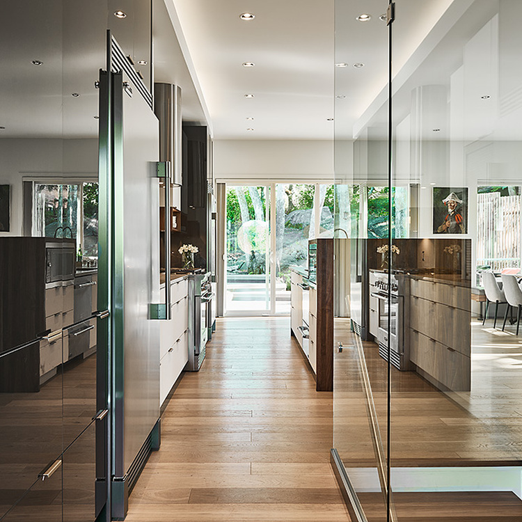 Warm wood floors and walnut accents ground the open layout, adding depth and cohesion. In the kitchen, matte white cabinetry contrasts with high-gloss grey and a wood-look backsplash, while a built-in dining banquette invites gathering.