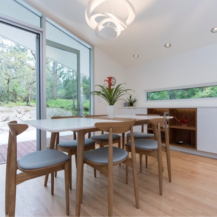 In the living room, a concrete fireplace anchors floor-to-ceiling windows, and the dining room opens to the patio, connecting the home to its forest surroundings.